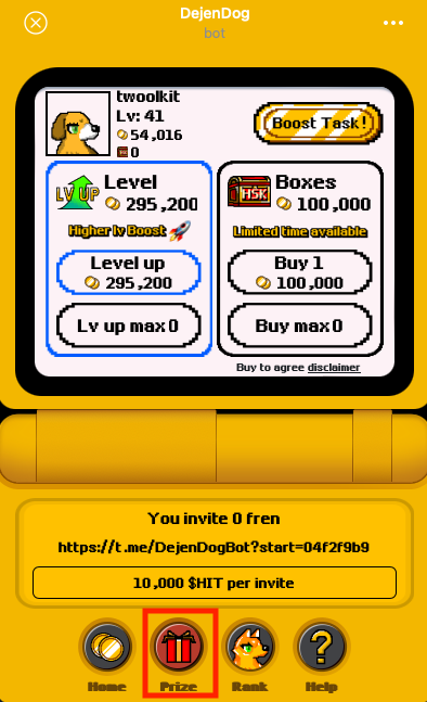 5. 꿀팁 대방출 (prize를 눌러서, 미션을 수행하면 강아지 레벨업을 한 번에 40까지 할 수 있고, 박스깡을 통해 HSK도 채굴 할 수 있음)
