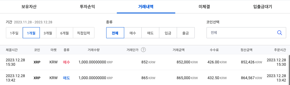 첨부한 이미지와 같이 글 작성일 당일 오후에는 매매가 2번 일어났으며, 리플 기준 총 4원의 시세차익을 낼 수 있었다. 이처럼 근래 거래에서는 손해거래가 발생하지 않고 꾸준히 시세 차익 수익을 발생시키는 중이다. (고로 신남)